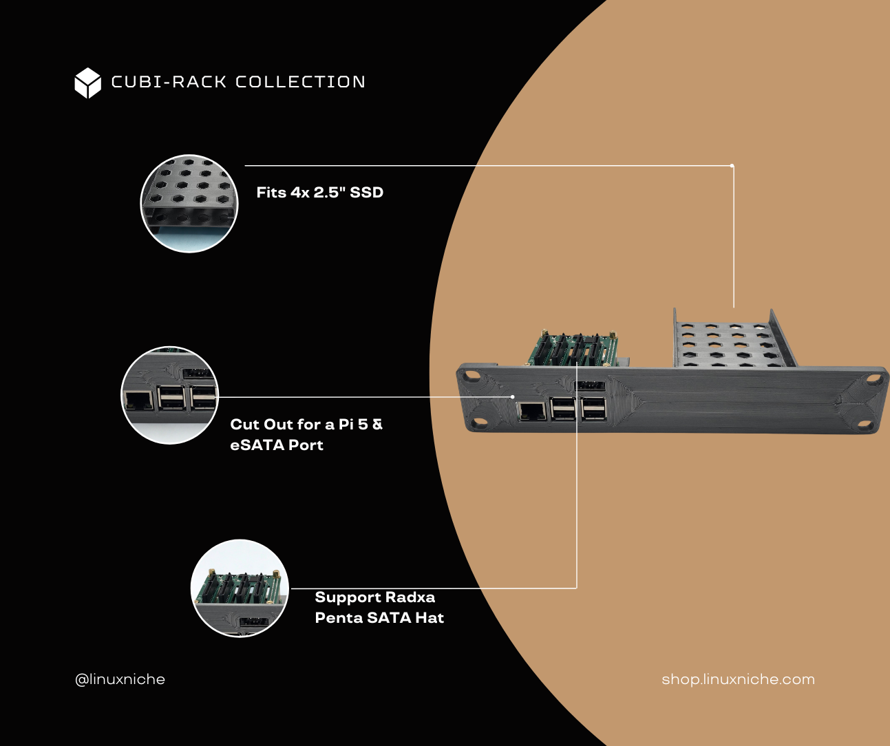 Turn your Raspberry Pi 5 into a powerful and compact NAS system with this custom-designed 1U Pi-NAS Shelf, built specifically for 10" mini rack systems like the Cubi-Rack, DeskPi Rackmate.